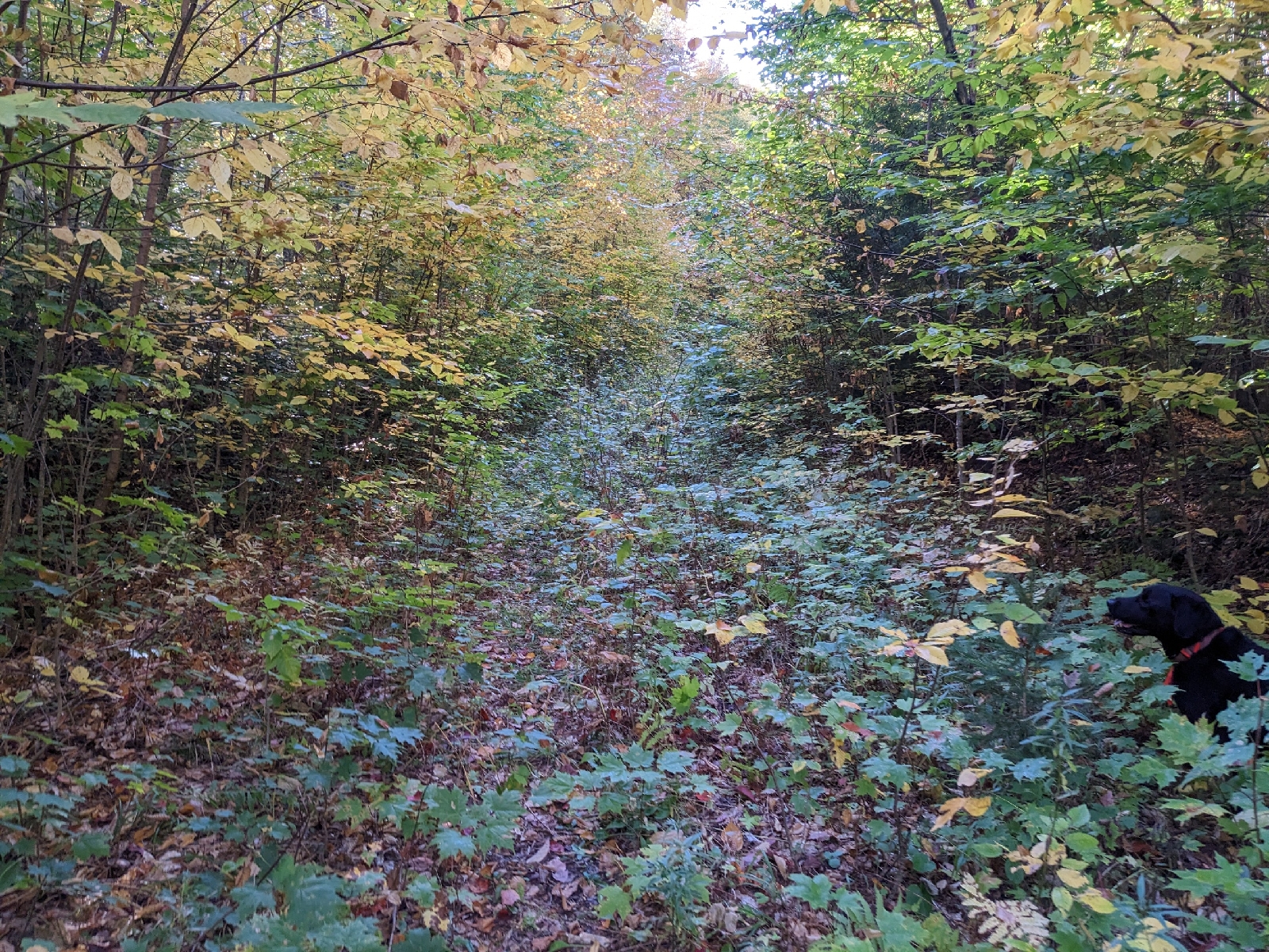 The trail was very lightly used, not marked in any way, and had numerous blowdowns, so it was quite tricky to follow. However, we were able to stay on it, more or less, until entering the hardwood forest, where logging had wiped out any trace of a trail that might have been there. From here, we followed a brushy old skid road down to a log yard on the road we walked on earlier in the day. From this point, we simply retraced our steps down the old road back to where we started.